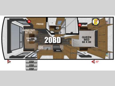 Load up your gear, clothing and food to start your journey exploring for the perfect spot to setup camp with this Back Country. You and your traveling companion will love the queen bed up front with privacy curtain, plus there is storage and USB ports on each side. If you are a family, one to two kiddos can sleep on the 40" x 84" U-shaped dinette in the rear that offers beautiful views out of the windows. The kitchen offers everything to keep everyone fed including a flip-up counter for extra work space. There is a full bathroom to keep everyone clean, plus a swing-out 32" TV for inside entertainment. And don't forget about the 17' awning when you want to relax outside with some protection from the sun.