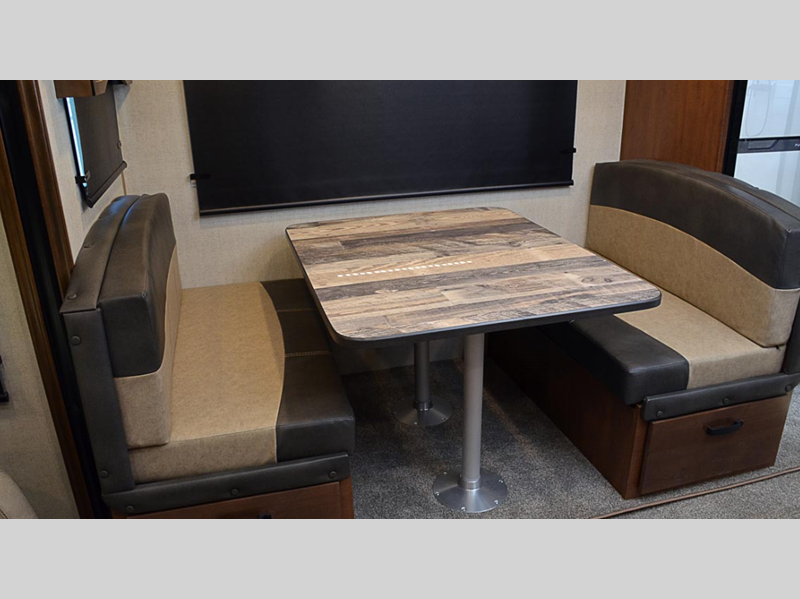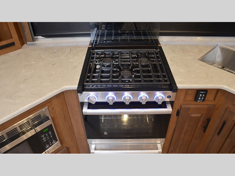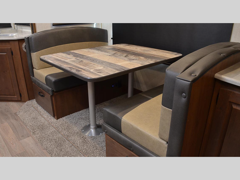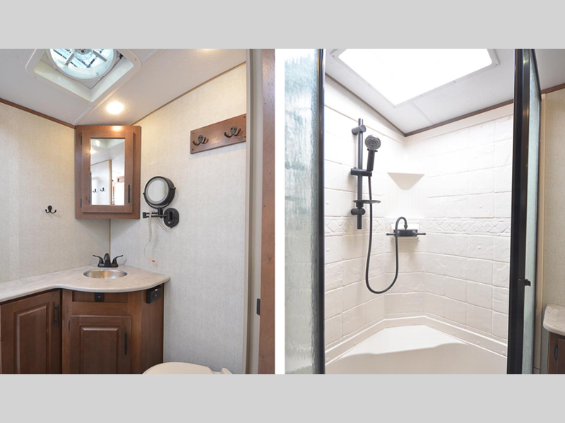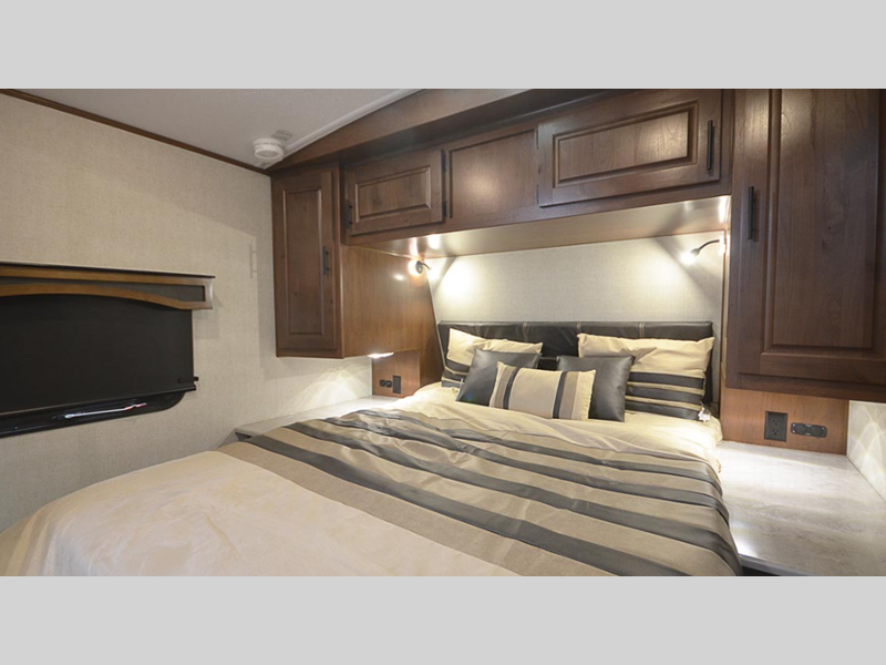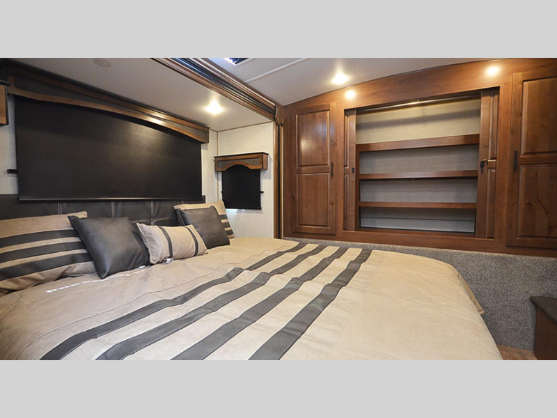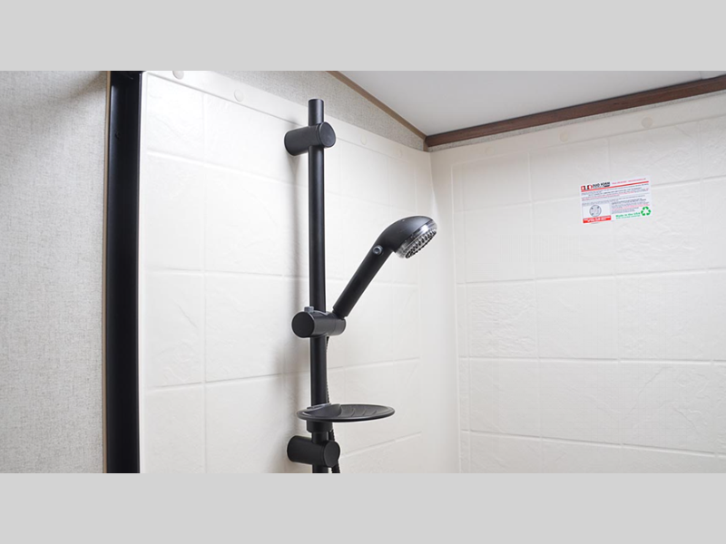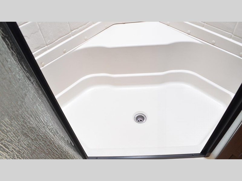 The Titanium Series models include a silver fiberglass front cap, frameless thermal pane windows for a more sleek look, and ground control TT auto leveling system for hassle-free set up. Head indoors to find hardwood throughout and all leather design, hardwood slide out fascia(s), and LG solid surface countertops. You'll be comforted each night by the premium memory foam mattress and mountain luxury bedding, and each model includes a mountain lodge bathroom with plenty of comforts and conveniences.