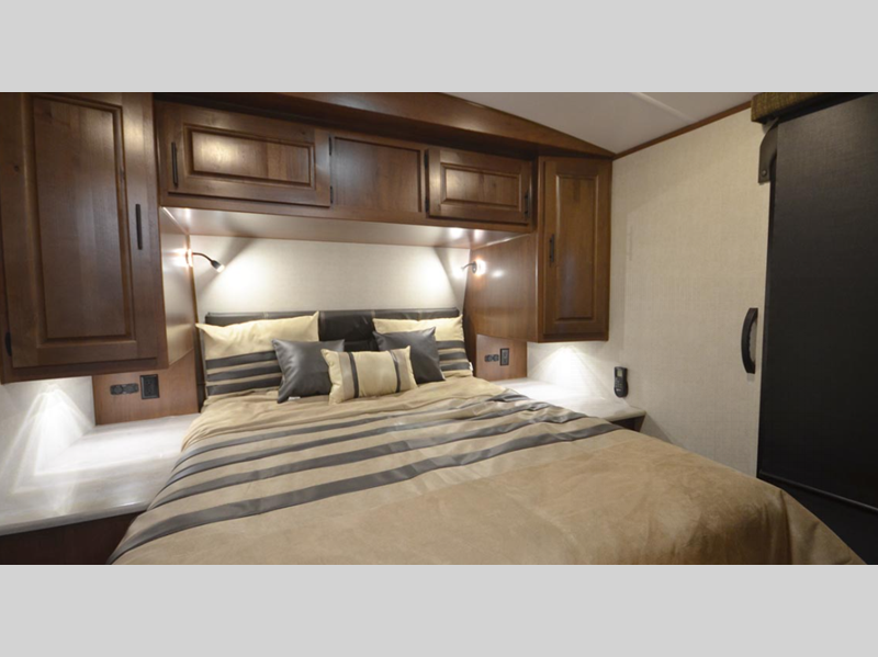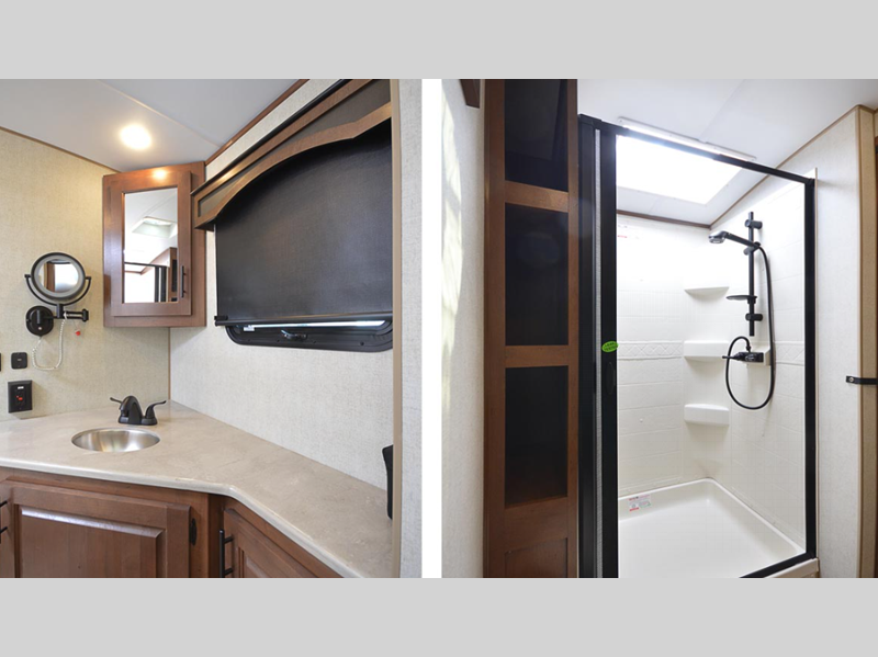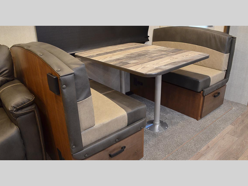 These models are designed with a rugged 8" chassis with XL ground clearance and 5,100 lb. axles for camping trips across the nation. You will appreciate the 10 gallon water heater, the XL refrigerator, plus the 15,000 A/C to keep you comfortable during the summer months. The mountain lodge interiors will have you feeling like you're staying at a lodge in the forest, and the LG solid surface countertops will add that touch of luxury.